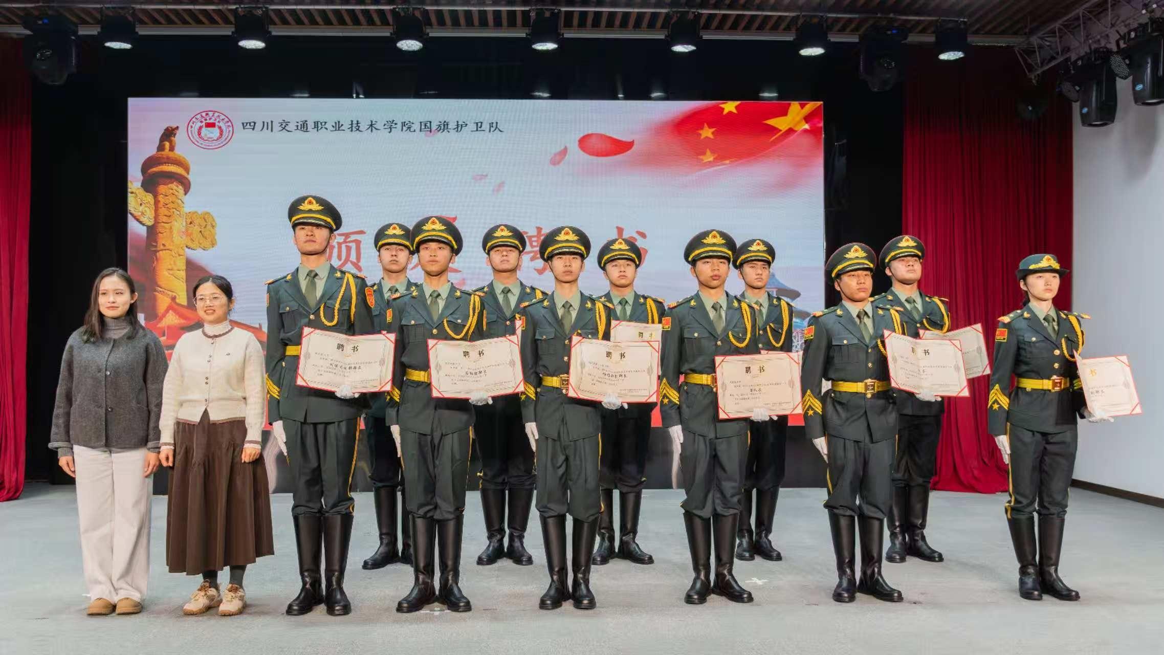 学院团委老师为第二十四届国旗护卫队骨干成员颁发聘书。一纸聘书,承载的是学院的信任与殷切期望。它传递的不仅是荣誉,更是护卫国旗、捍卫尊严的无限责任。